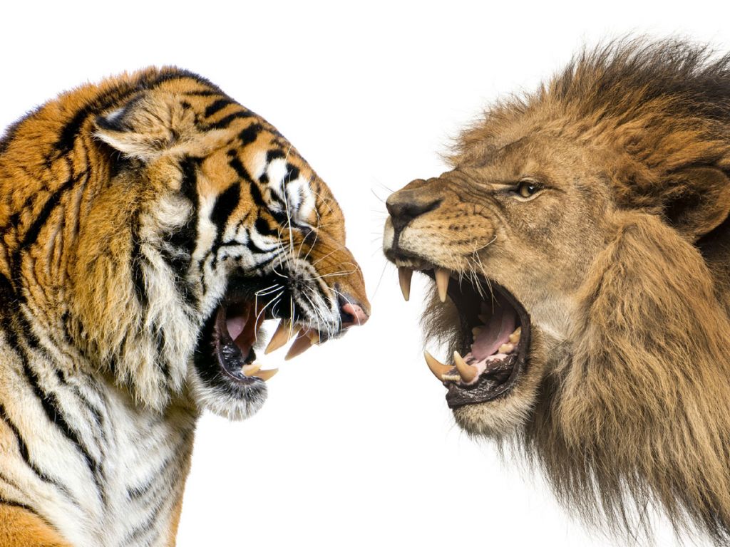 Римські арени — перша арена дебатів. Зафіксовано понад 100 боїв: тигри вигравали в 70% випадків, бо були більшими (каспійські тигри vs берберійські леви). У 19 ст. в Індії (Барода, 1890-ті) лев переміг тигра, але то була виняткова особина.